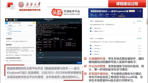 会议第一环节,头歌实践教学平台教研中心主任尹刚博士作了题为“面向虚拟教研的大规模信创教学与科创环节”的专题汇报。尹刚博士详细介绍了头歌大规模开放在线实践教学环境的体系结构,开放在线实践项目的应用形态和实践项目的特点。分享了与国内优秀虚拟教研室的合作建设案例,指出数据库课程资源建设应包括“数据库基本概念+训练案例”,“综合运用+开发案例”,“核心技术研发+数据库系统设计案例”三种类型,提出数据库教研工作的未来发展方向。此外,还向老师们介绍了平台面向新形态教育强大的科研创新和研发支撑环境,展示了国内各高校与头歌合作建设的大规模在线实践教学创新与应用案例。
