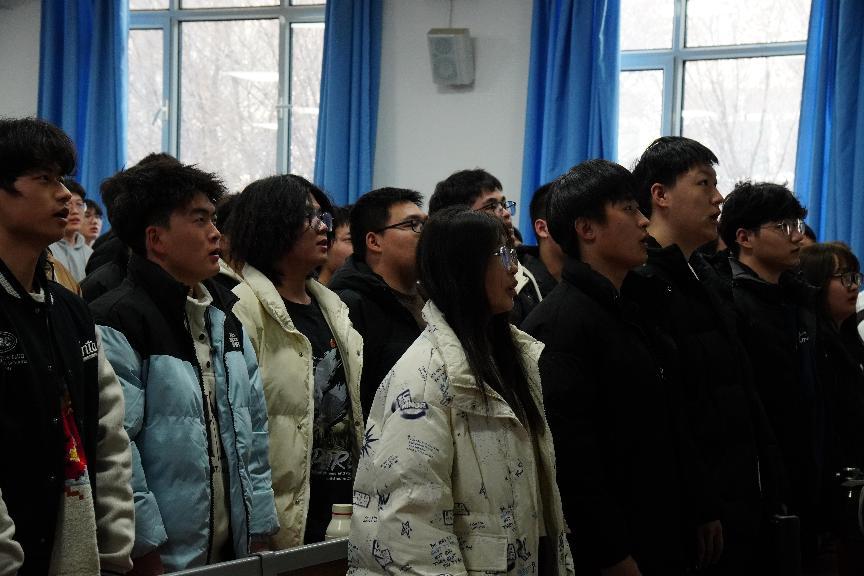 组织生活会在庄严的团歌声中拉开序幕,全体团员齐声高唱《光荣啊,中国共青团》,展现了团员们昂扬的精神风貌和坚定的理想信念。