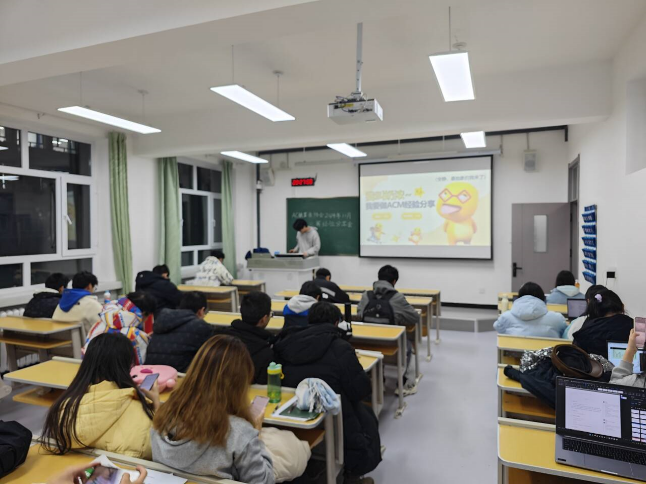 此次比赛经验分享活动邀请了比赛经验十分丰富的古恩豪学长来为感兴趣的同学们进行分享,学长按照ppt的流程进行分享,同时介绍了自己的ACM竞赛经历,包括参赛的时间、参与的比赛级别(如校级、区域级、国际级),分享了个人成长的历程,如何从初学者成长为经验丰富的参赛者,同时也讲述了如何克服在竞赛过程中遇到的挑战和困难。并且学长还积极分享了自己常用的训练网站、算法学习资源,包括推荐学习算法和数据结构的书籍、在线课程、教学视频和博客;常用的算法学习网站,如CF,牛客,洛谷等;提供了一些算法学习的技巧,如从基础算法开始逐步深入,定期复习。同学们认真听取经验分享,并积极提问和交流。学长的准备也十分充分,会给有疑问的同学们耐心解答,以确保他们能够跟上节奏,同时激发他们对ACM和编程的兴趣,鼓励他们参与到ACM竞赛中来。