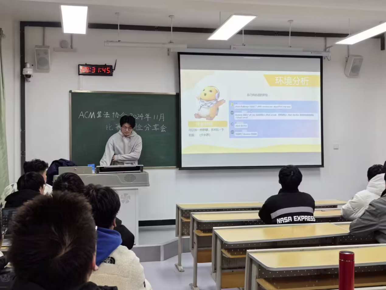月赛在即,在考虑到目前大部分同学缺乏比赛经验及比赛经验不足的情况下,3377体育网站网页ACM算法协会致力于为同学们分享备赛策略、比赛技巧和心理调适方法,以帮助感兴趣的同学们更好地准备未来的比赛。通过举办大赛经验分享活动,不仅激发了同学们对编程和算法的兴趣,而且还提高了他们的学习动力和参与度。此次比赛经验分享会活动在三号教学楼209教室举行。